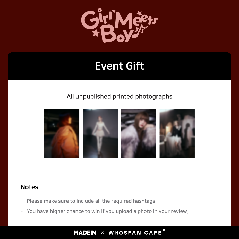 Visit MADEIN 'Girl Meets Boy' Official Themed Cafe or participate in the online event and leave your review on social media channel.