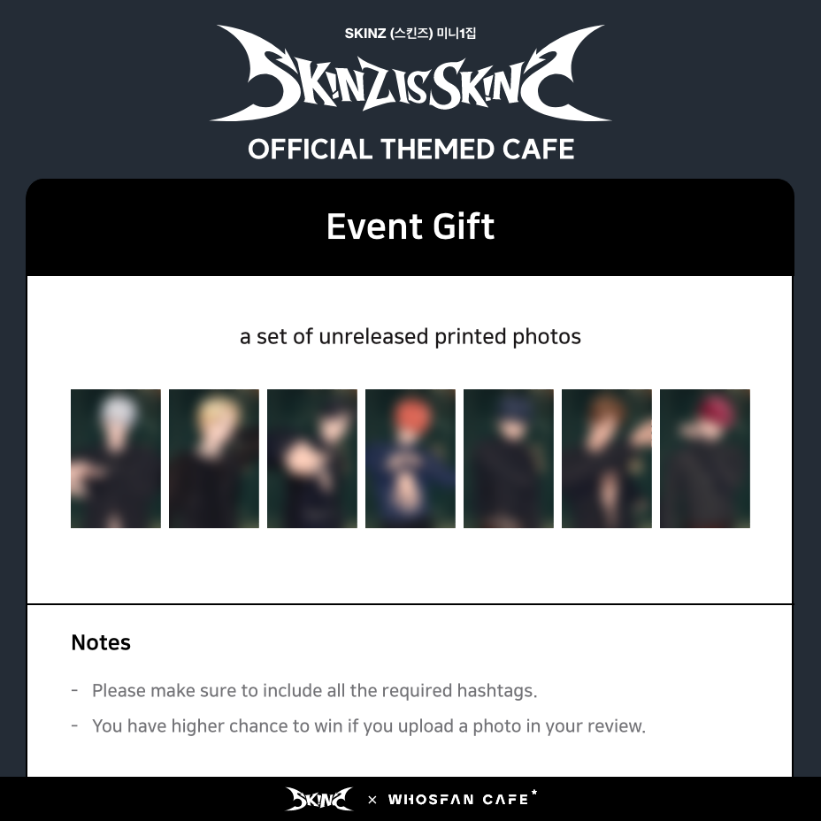 1. Visit SKINZ (스킨즈) 미니 1집 [SKINZ IS SKINZ] Official Themed Cafe and write a review on social media channel