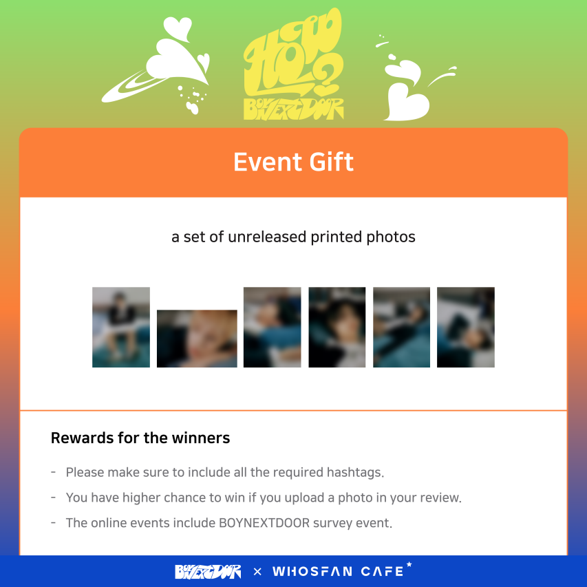 - Se entregará una pvc autografiada por BOYNEXTDOOR (6ea / al azar) al participante que gane la photocard con un diseño especial.