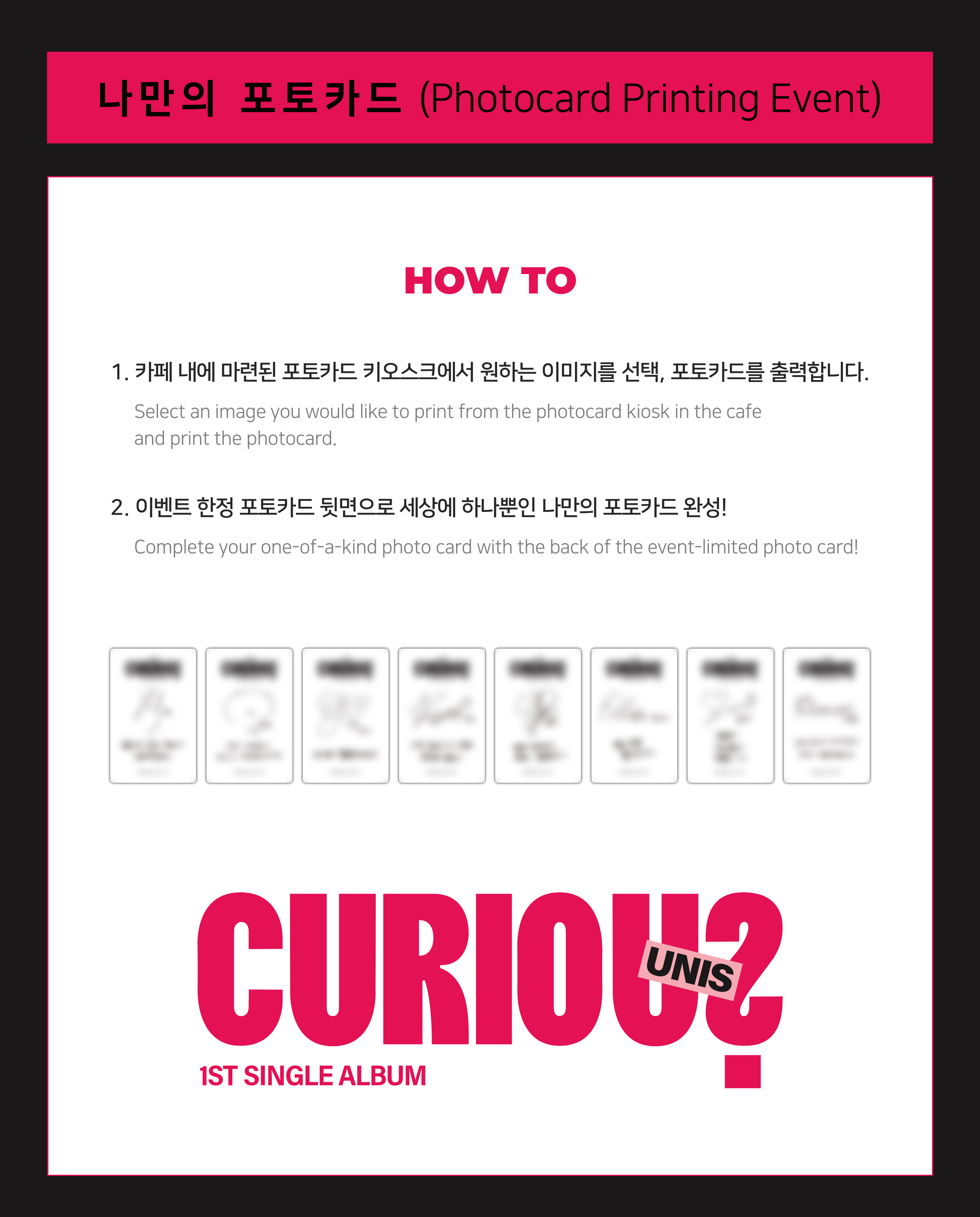 Visita el Café temático oficial de 1st Single [CURIOUS] de UNIS o participa en el evento online o deja una reseña del evento en tus redes sociales. Seleccionaremos participantes al azar y enviaremos un set de fotografías impresas inéditas.