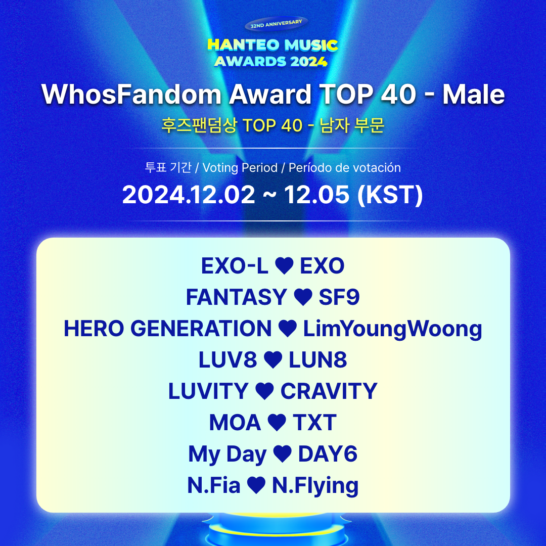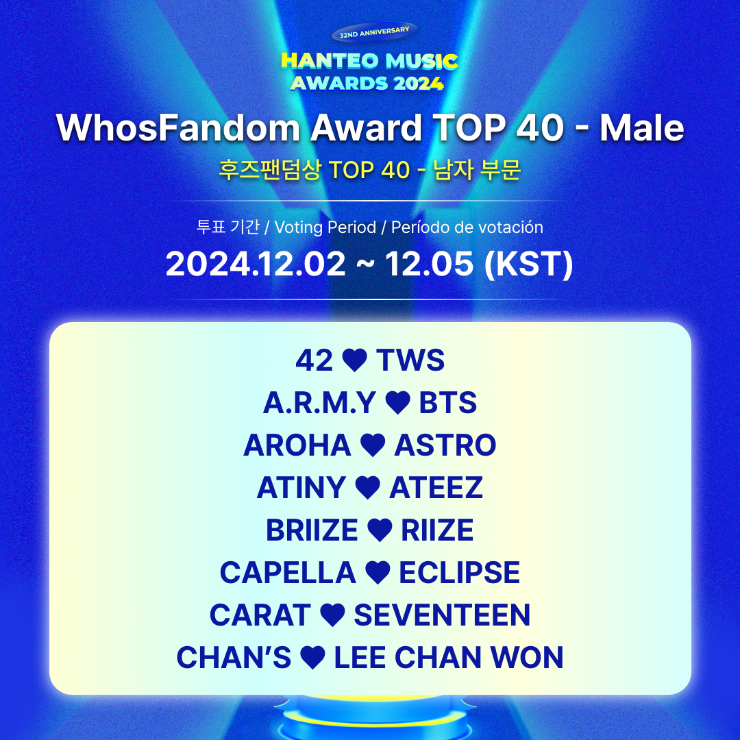 - Categorías de votación: Premio WhosFandom Artista Masculino, Premio WhosFandom Artista Femenina