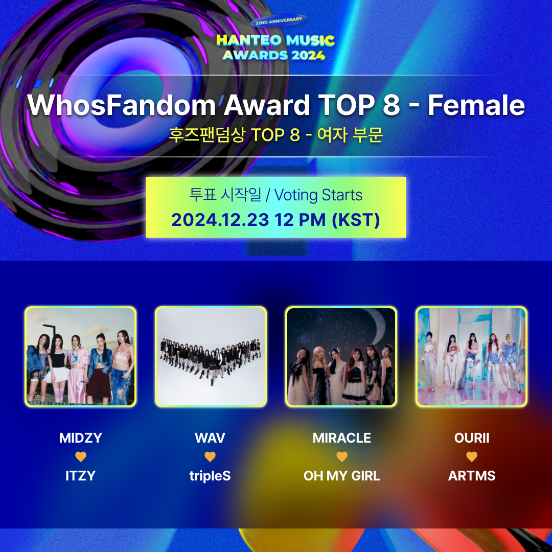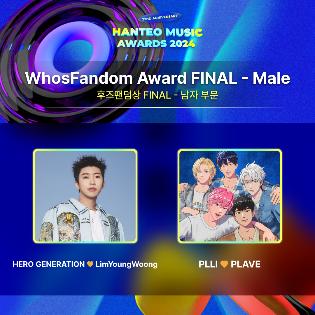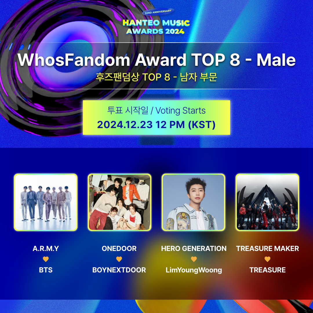 La votación del premio WhosFandom para HANTEO MUSIC AWARDS 2024 se divide en dos categorías: artistas masculinos y artistas femeninas, y los artistas que llegan al TOP 1 a través de la votación recibirán el premio WhosFandom.