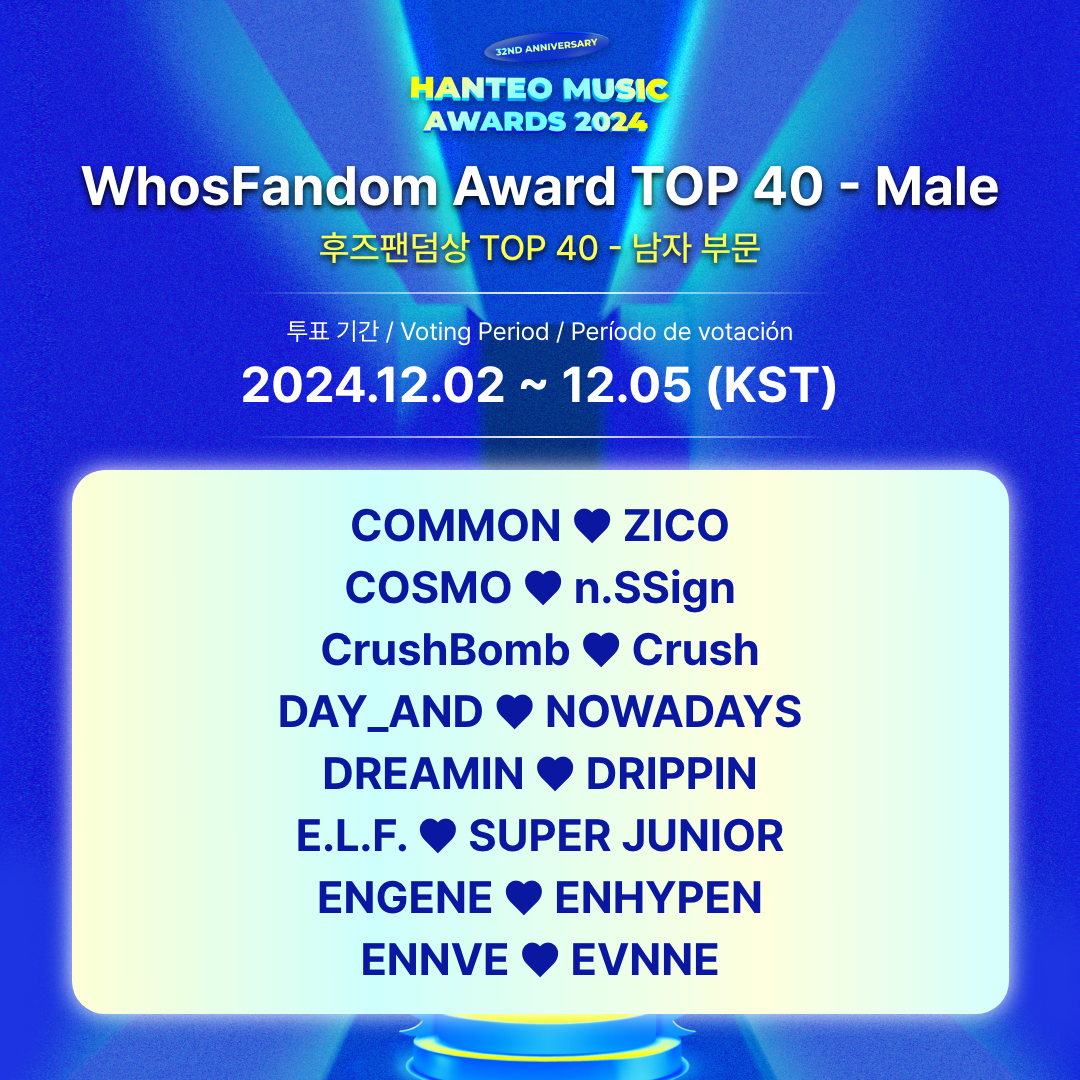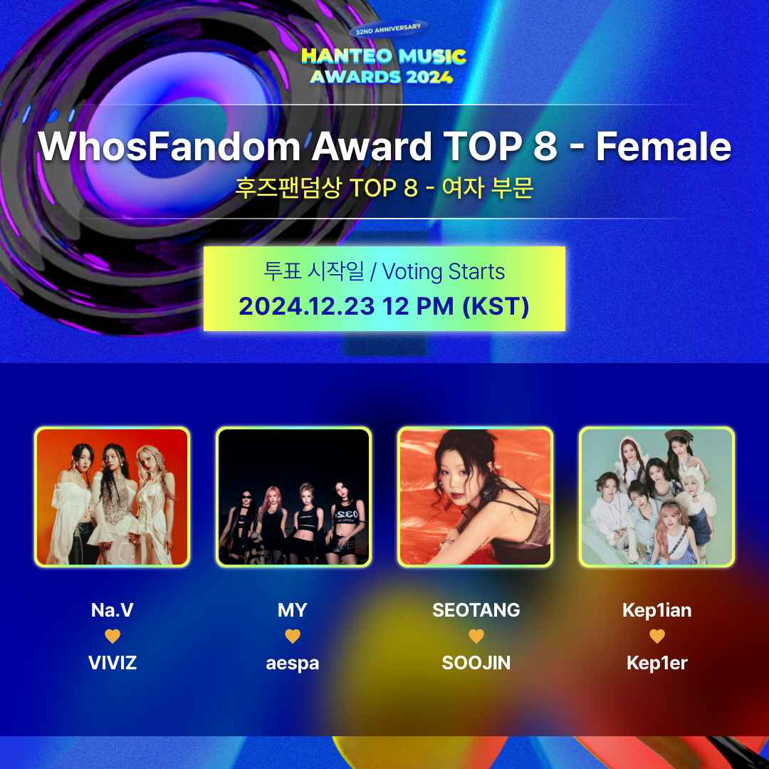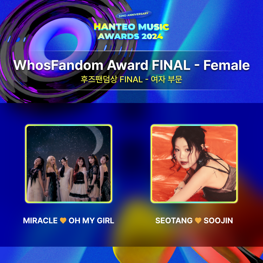 La votación del premio WhosFandom para HANTEO MUSIC AWARDS 2024 se divide en dos categorías: artistas masculinos y artistas femeninas, y los artistas que llegan al TOP 1 a través de la votación recibirán el premio WhosFandom.