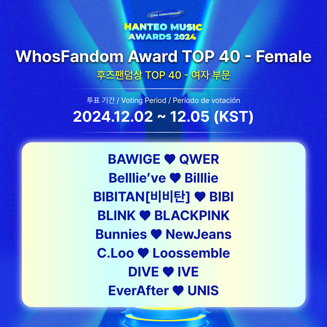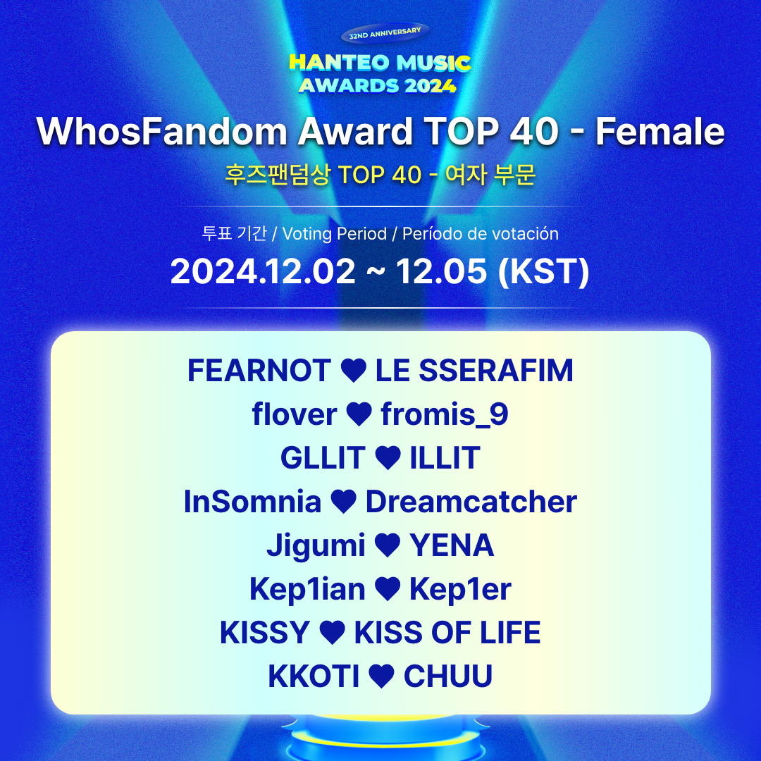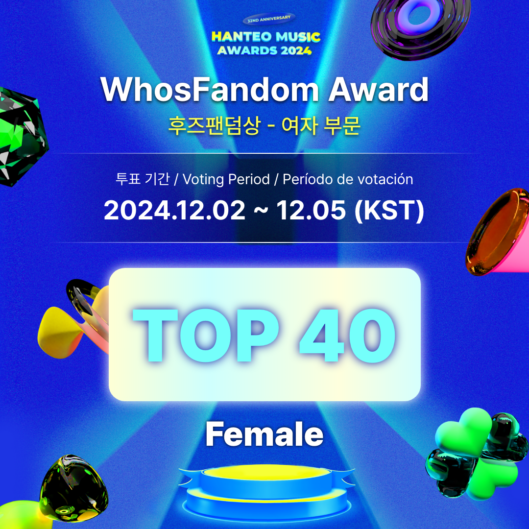 - Período de votación para el TOP 40: 2024.12.2 12:00 PM ~ 12.5 11:59 AM (KST)