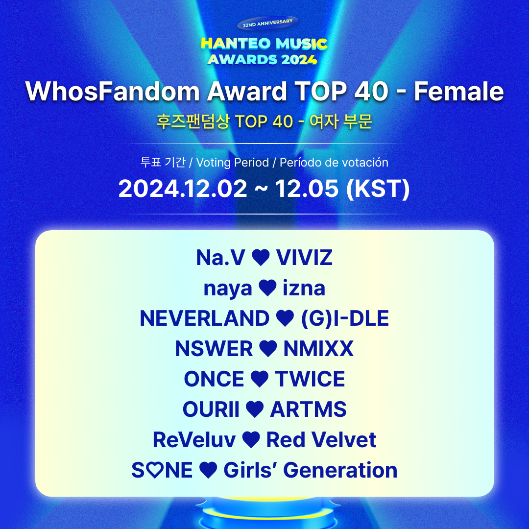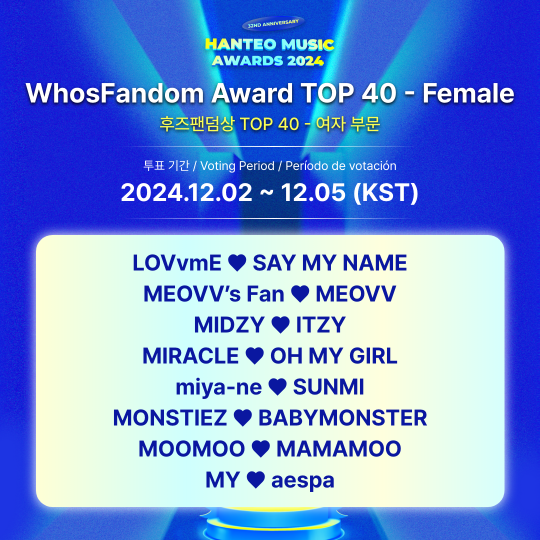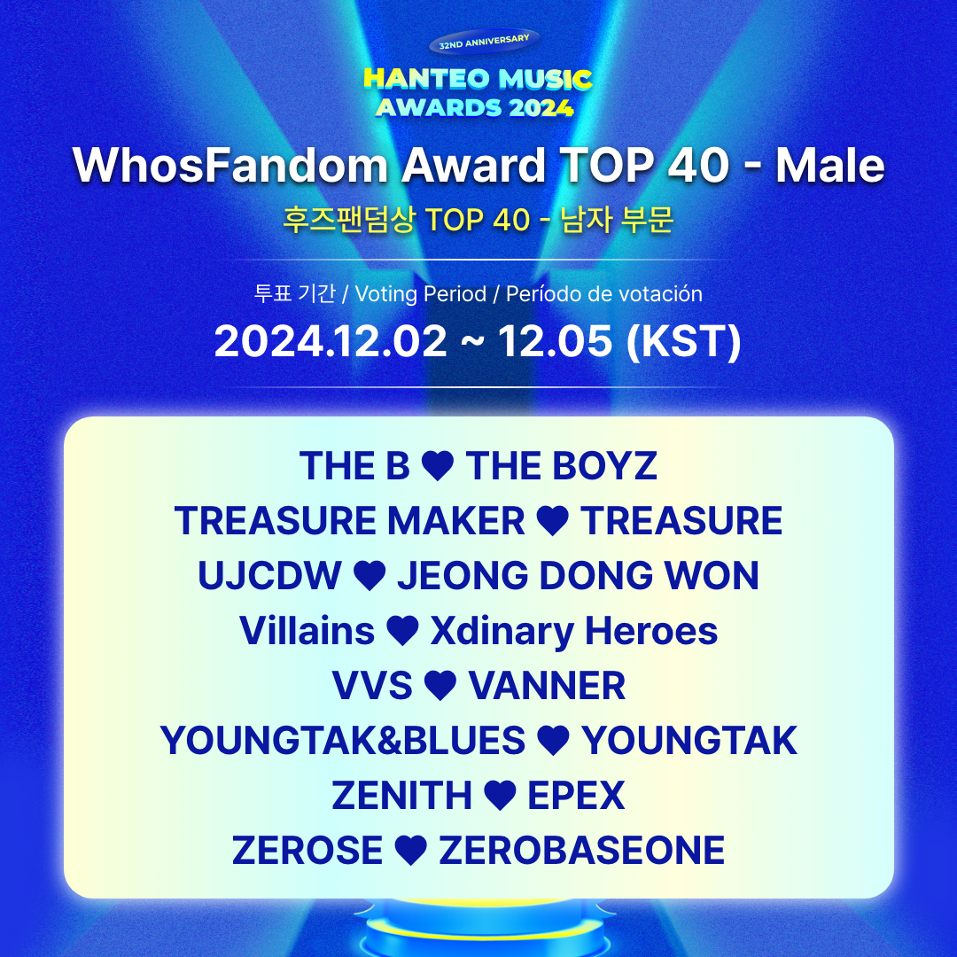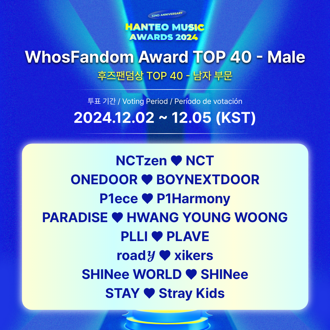 - Período de votación para el TOP 40: 2024.12.2 12:00 PM ~ 12.5 11:59 AM (KST)