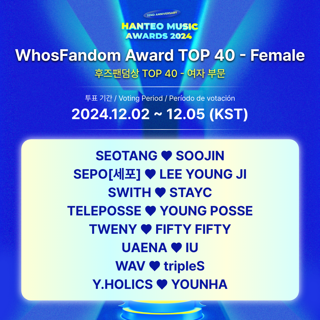 - Plataforma de votación del TOP 40: Cuenta oficial de Whosfan en X (anteriormente Twitter / @Whosfan_Ofcl)